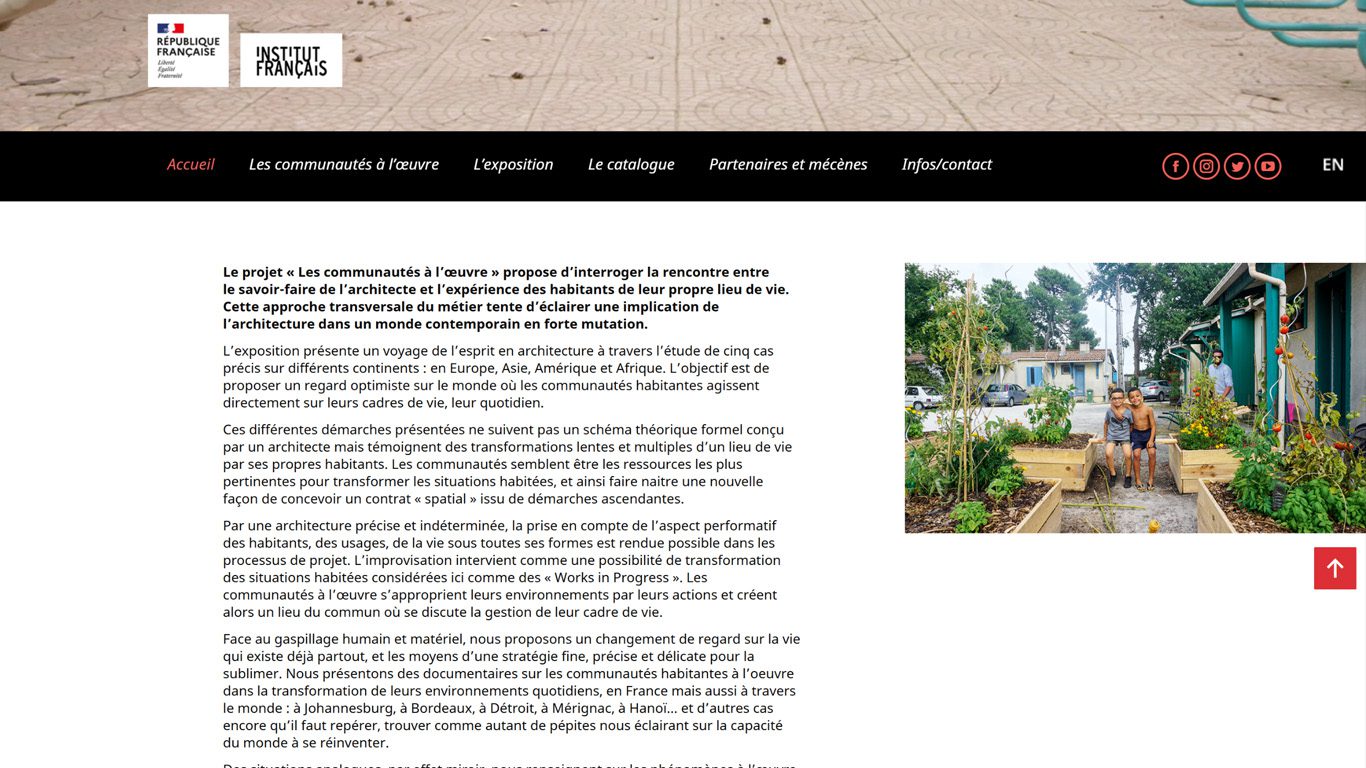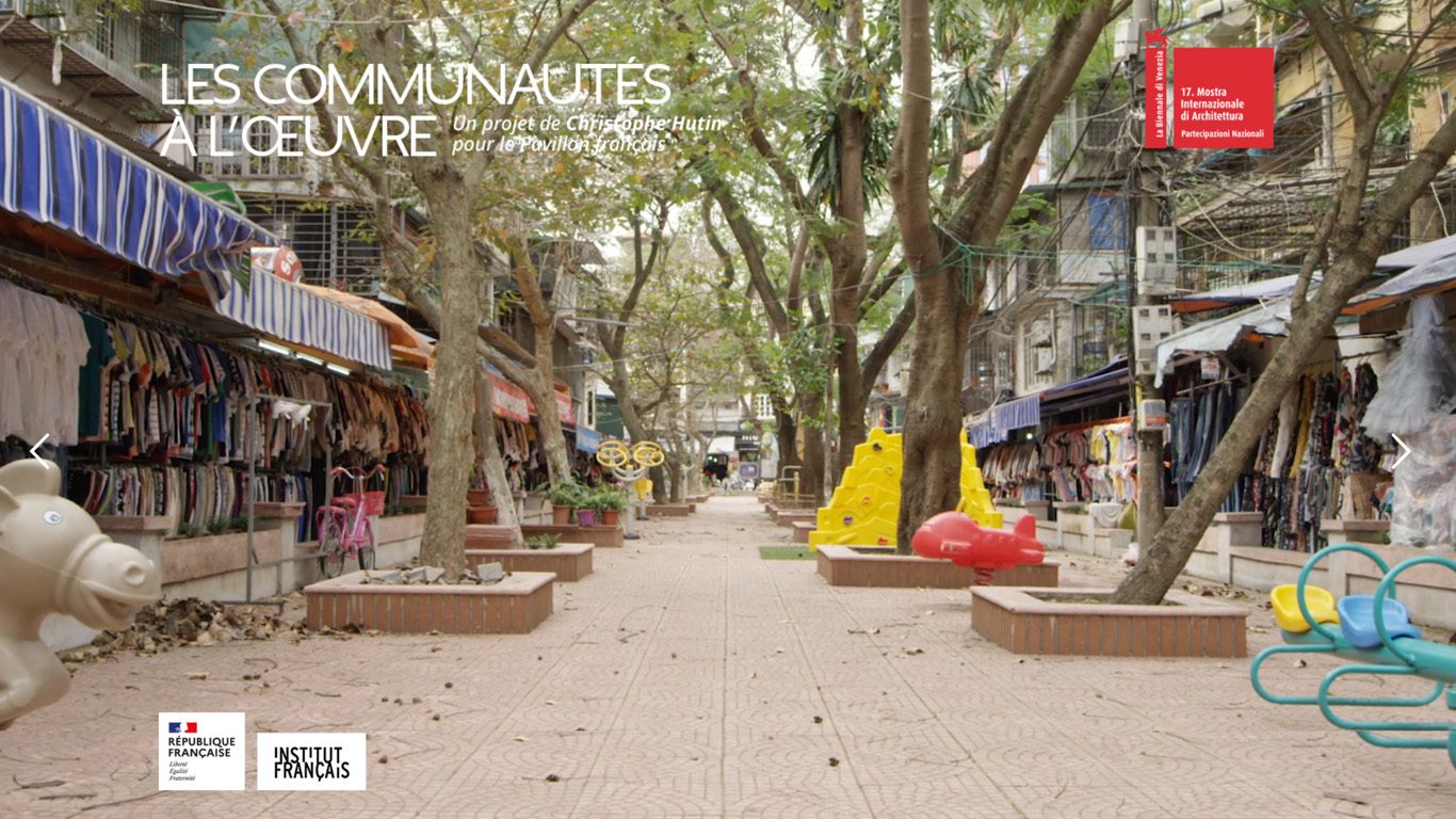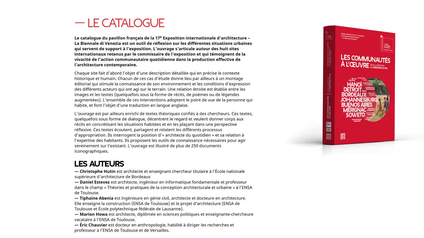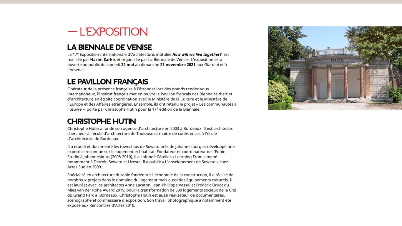 Conception d’un site web trilingue (français, anglais, italien) pour le Pavillon français de la Biennale d’art et d’architecture. Projet « Les communautés à l’œuvre », porté par l’architecte Christophe Hutin pour la 17e édition de la Biennale.