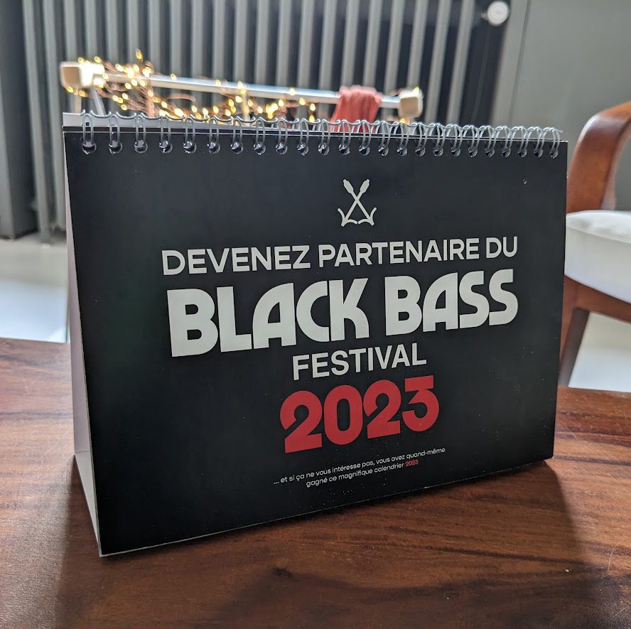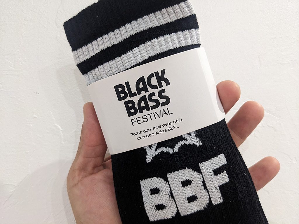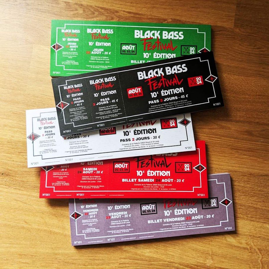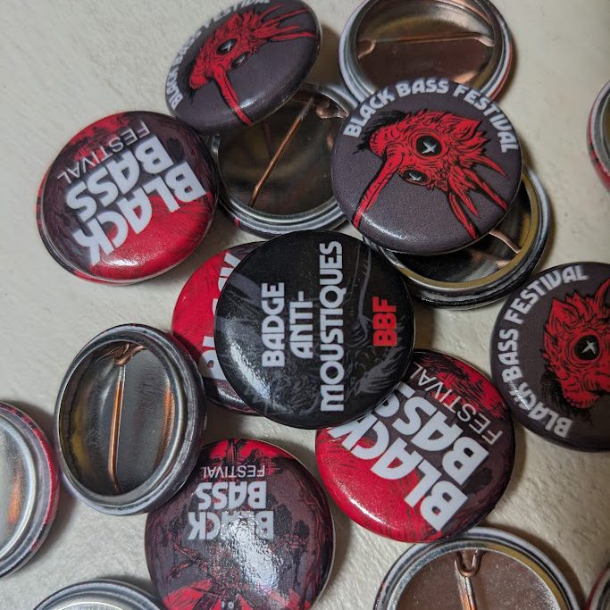 Fabrication d’objets et de merchandising pour le Black Bass Festival, déclinaisons graphiques : textile, objets, casquettes, gobelets, bracelets, badges, bâches, billets…
